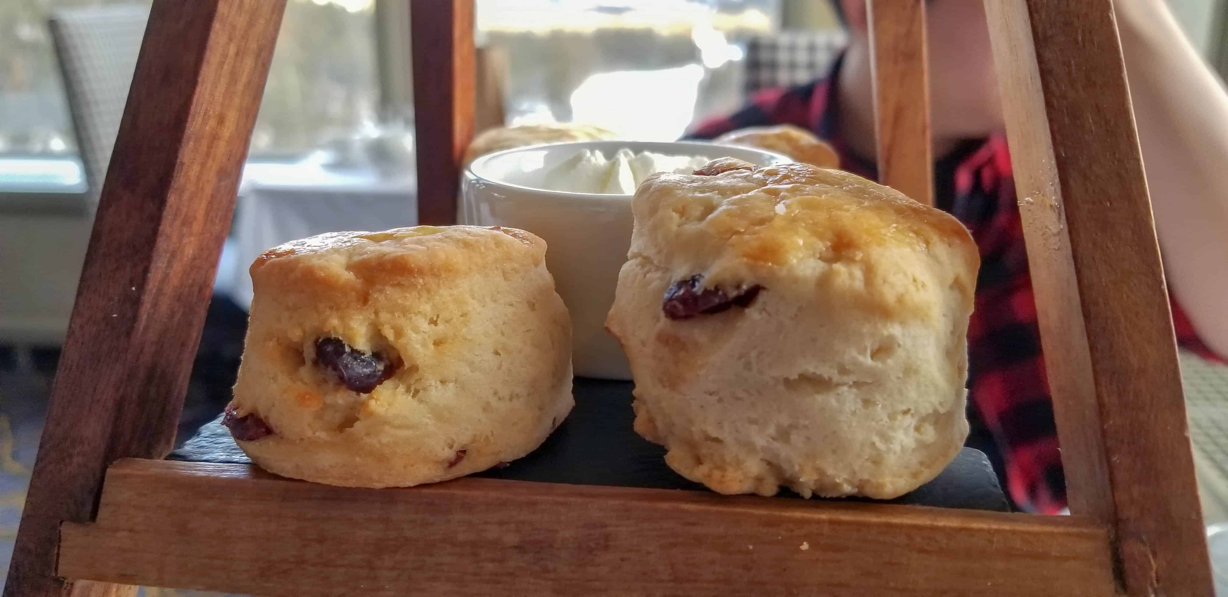 All the food comes out at once on a wooden stand with the scones (regular and cranberry) on top with some citrus clotted cream and a few jam flavours!