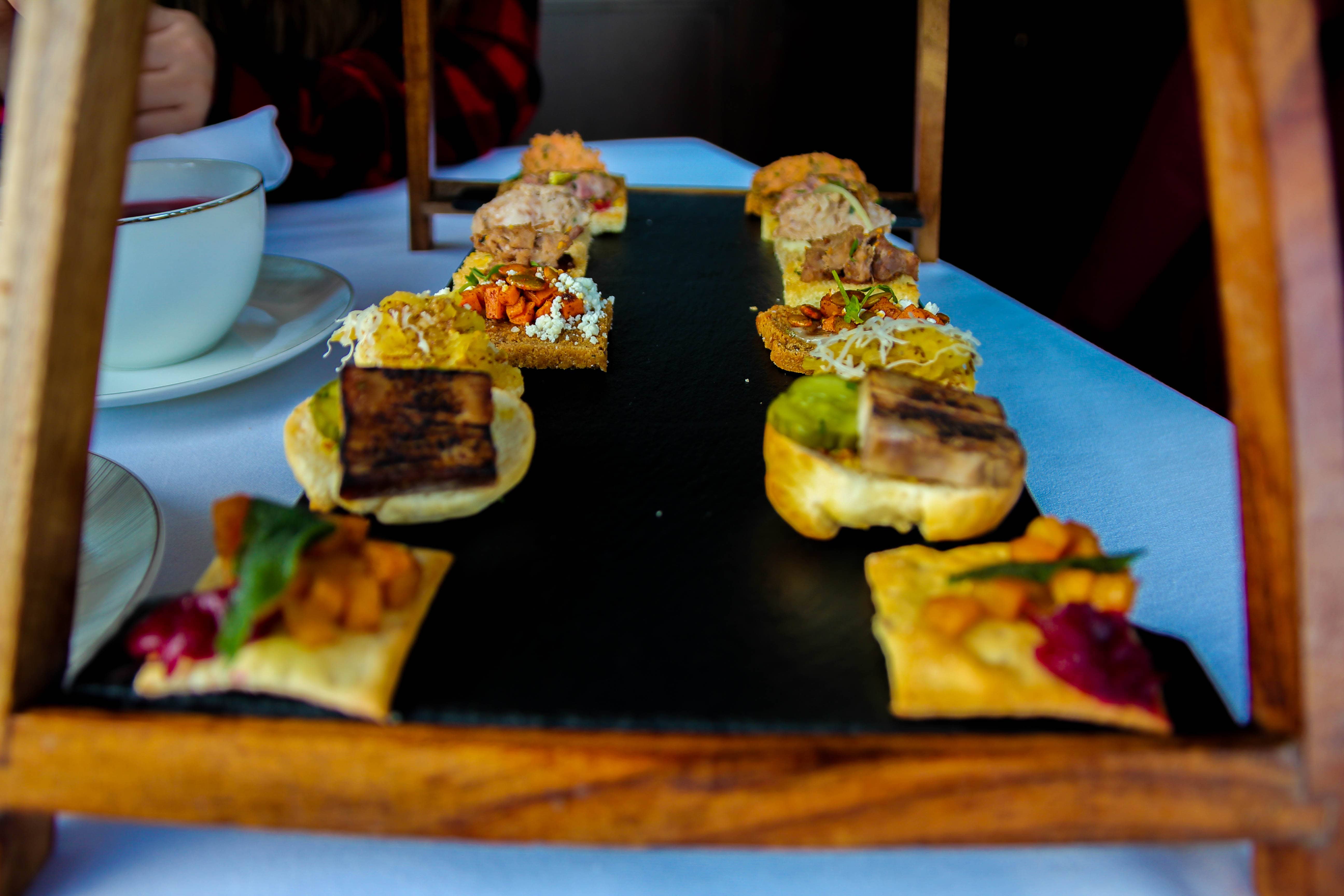 The savoury bites are at the bottom and are Boar Rillettes (boar, roasted parsnip & horseradish spread with house caraway sauerkraut and chives on white rye), Confit Goose (orange zest, port fig chutney, goose on brioche), Roaster Butternut Squash (butternut squash, cranberry chutney, fried sage leaves on a Caraway cracker), Roasted Sweet Potato (sweet potato, sage aioli, spiced pumpkin seeds, feta and pea shoots on Russian Rye), Pork Belly (pork belly, maple pommery mustard and B&B pickles on a brioche bun), Yellow Beet Relish (beet, red beet powder, chevre noir and candied walnuts on bannock), Hot Smoked Trout Rillettes (trout, lemon aioli and chives on Russian Rye) and finally a Smoked Duck Breast Salad (duck, cherry chutney, orange zest and pistachios on a brioche crostini).
