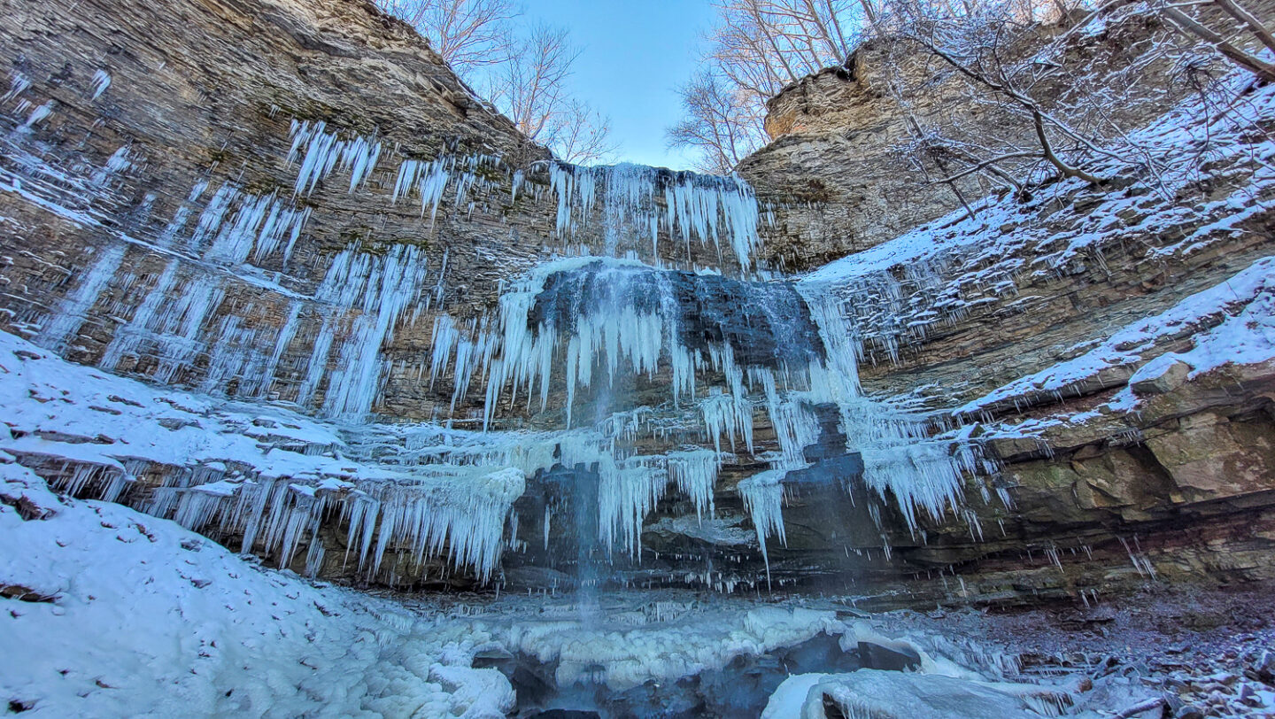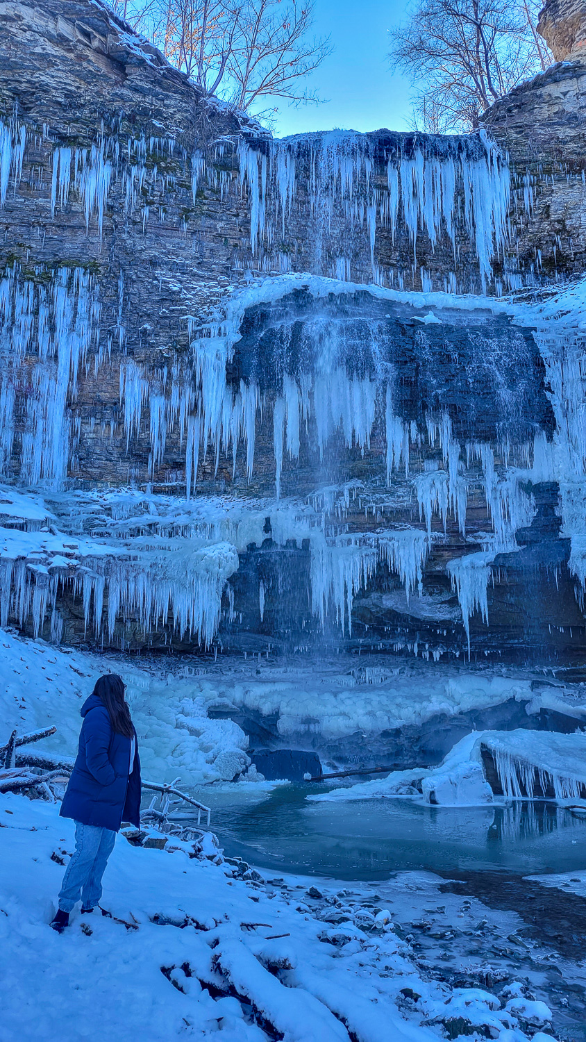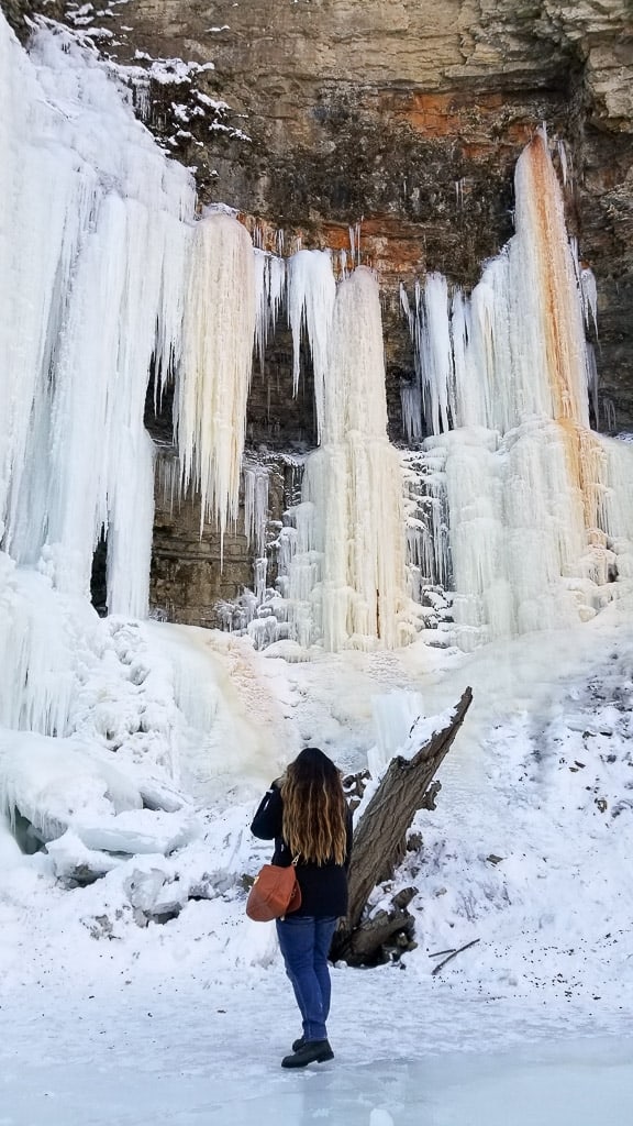 Since I originally posted this blog post we’ve gone back to explore several other frozen Hamilton waterfalls. Our initial visits were to Tew Falls, Webster Falls and Tiffany Falls. We’ve then gone back to Tiffany Falls a second time cause it’s so lovely frozen. After that we discovered Felker’s Falls which is one of my favorites as it’s still relatively unpopular and we had the trail totally to ourselves. Our most recent winter Hamilton waterfalls experience was a full day exploring Devil’s Punchbowl, Albion Fall, Sherman Falls and Borer’s Falls so in total you’ve got 8 beautiful falls below to explore. Some are easier with a viewing platform while some are a short walk and others a hike. Depending on what you’re in the mood for one of these is bound to fit the agenda!