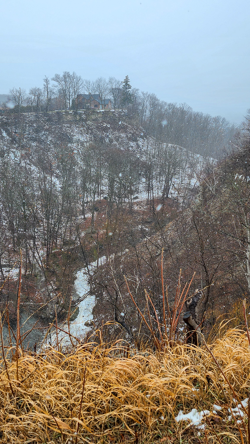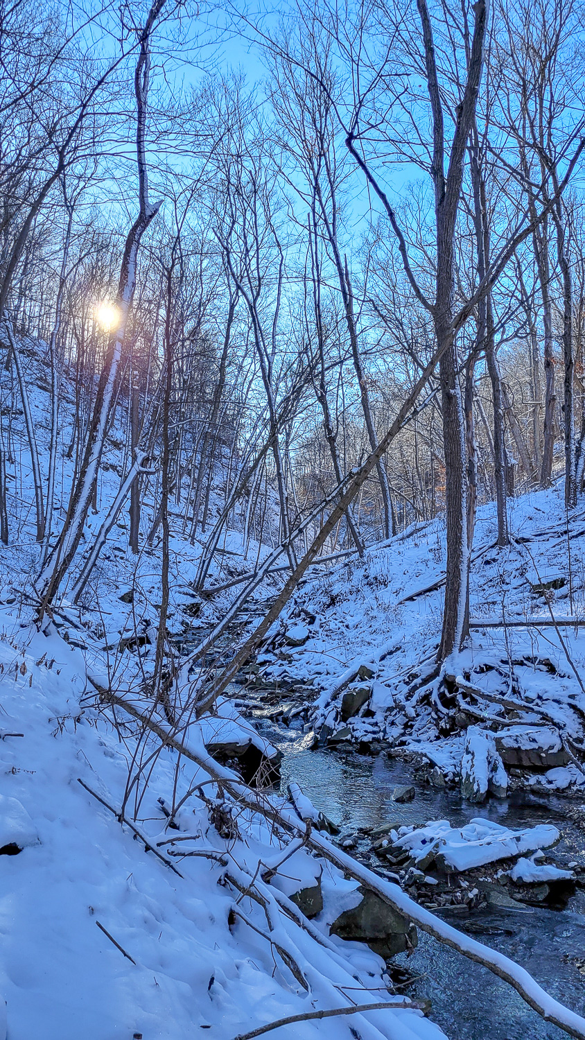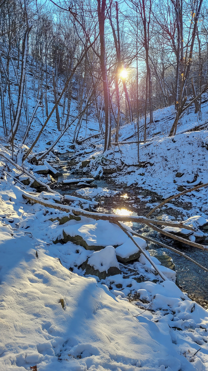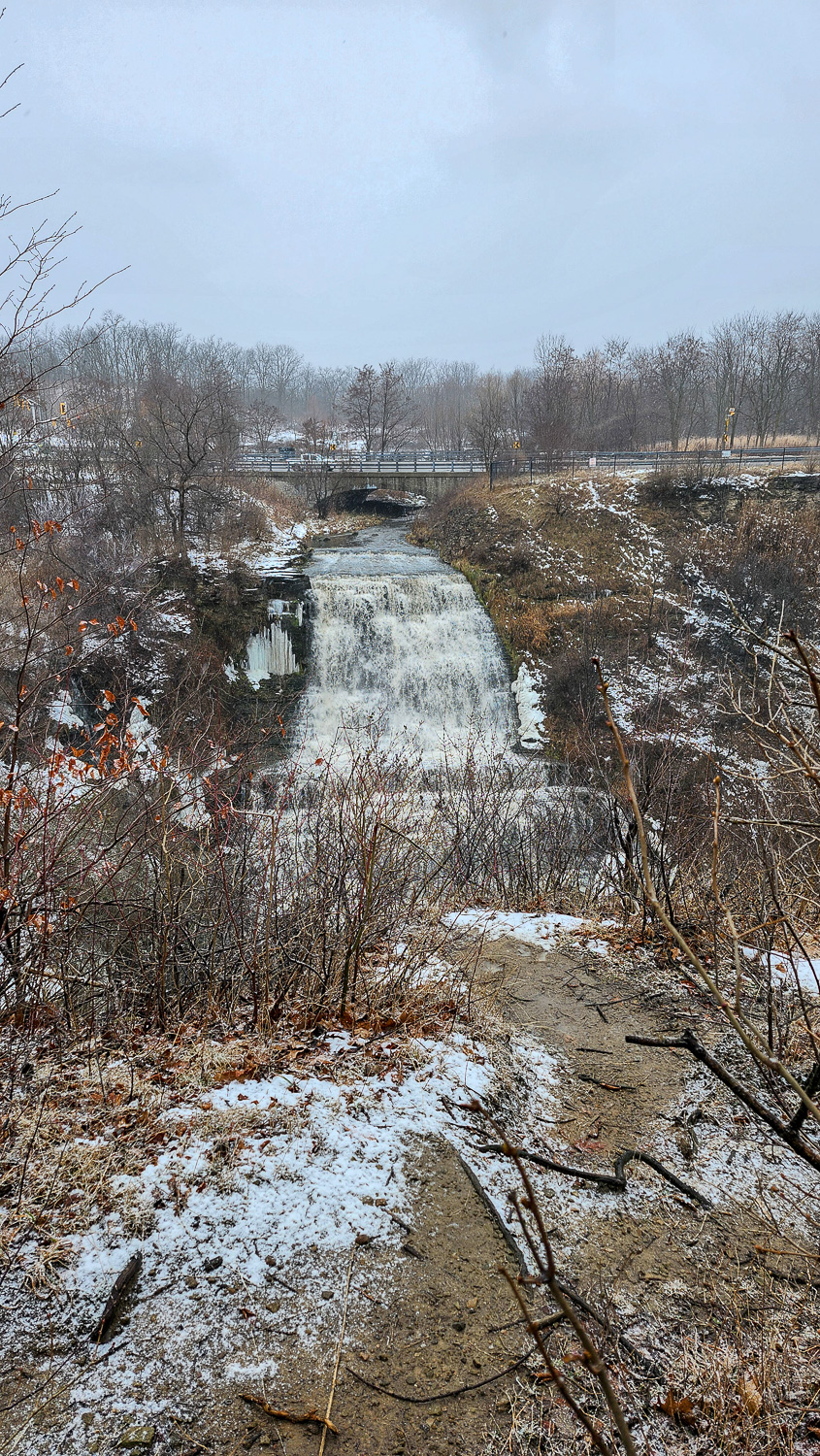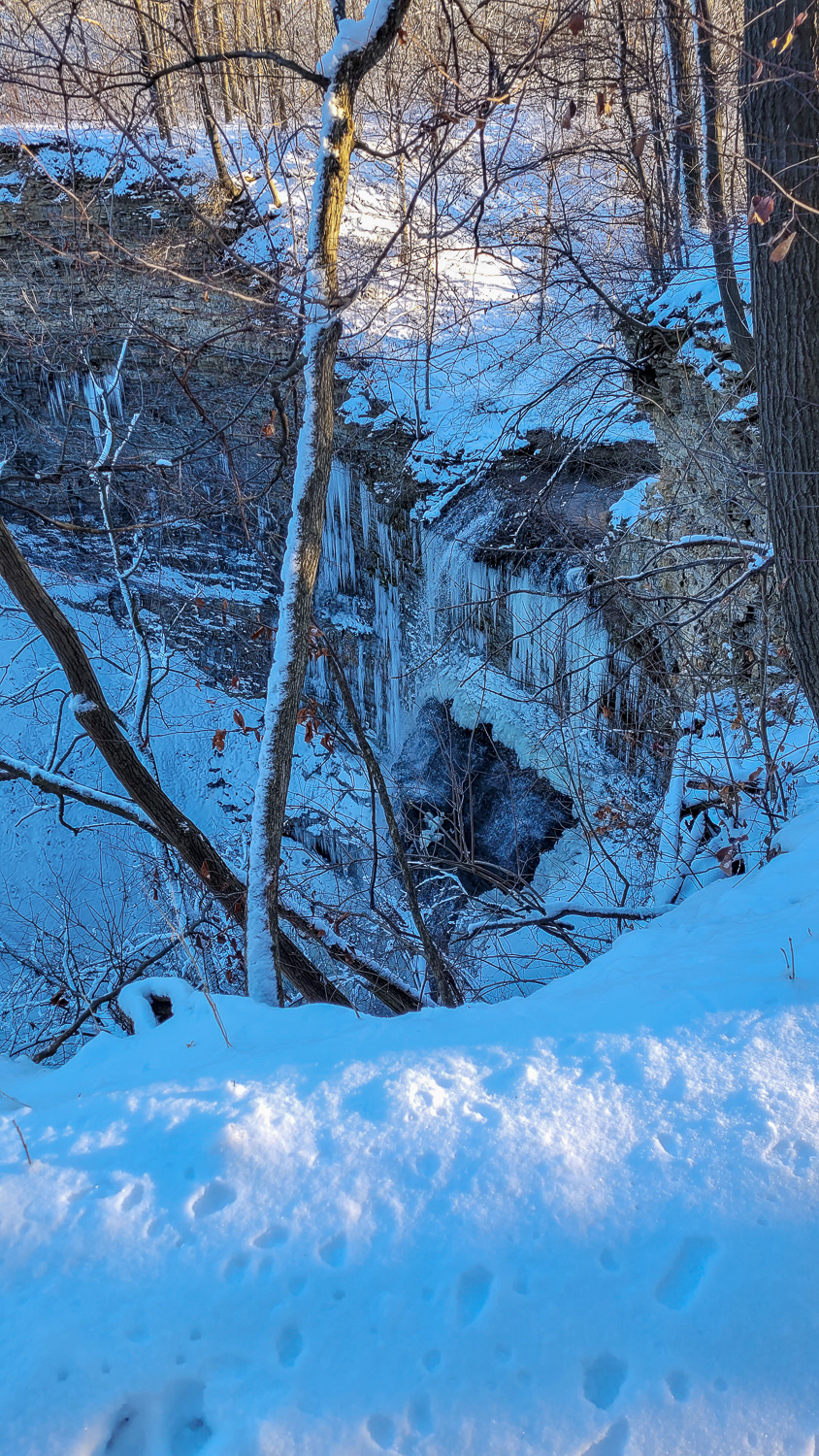 Even when the upper falls does freeze over there is still a little bit of flow so it’s cool to try to catch that. If you walk along the road, carefully, you can actually see the top of the upper falls where the stream comes from.