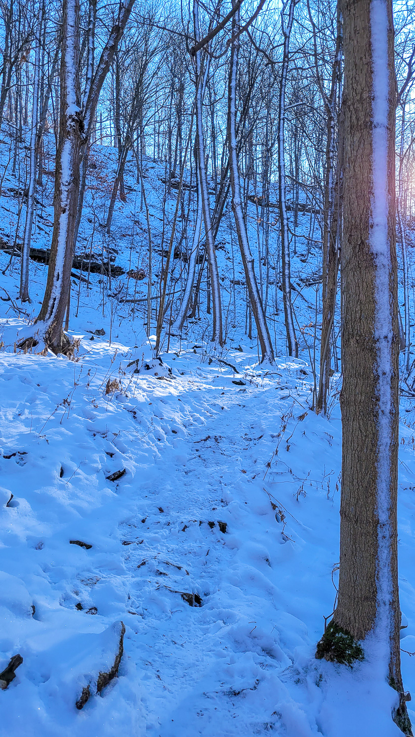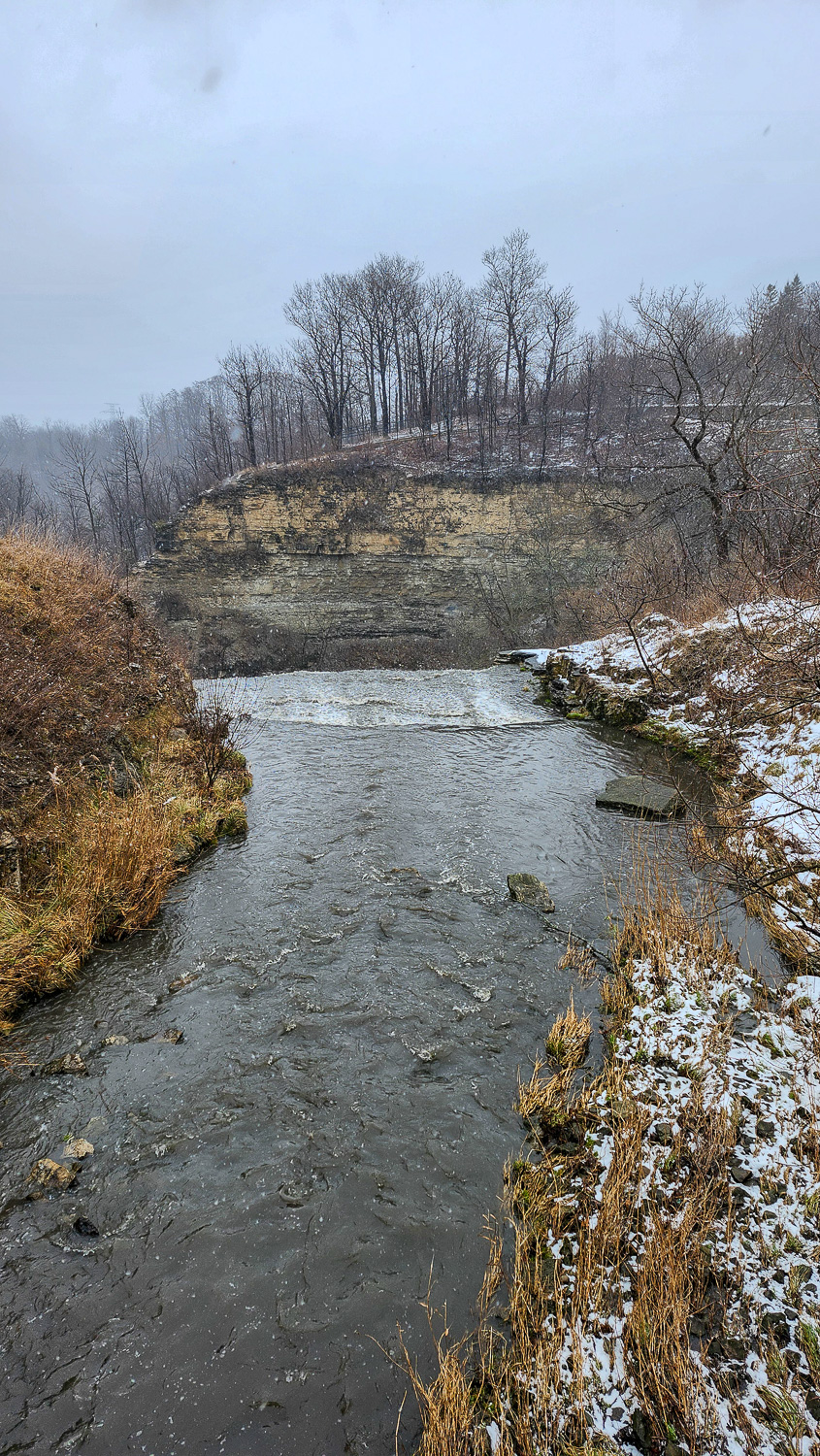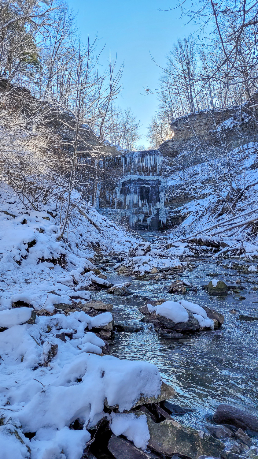 If you’re looking to get to the bottom of the falls it’s a slightly harder journey. It’s definitely not accessible and you will require some pretty good shoes to get through it. We had spikes underneath our boots and it was still slippery in some places. There’s a trail entrance by Quigley Road/Hildegard Drive. You walk straight in towards the river, make a left and then follow the trail/river all the way to the falls. We did have to cross the river on some stones at some point. You’re not going to get an accurate distance on google maps cause it keeps trying to default back to the conservation area but I want to say the walk to the falls took us about 45 minutes just cause we were being super careful but it was much quicker back to the car afterwards.