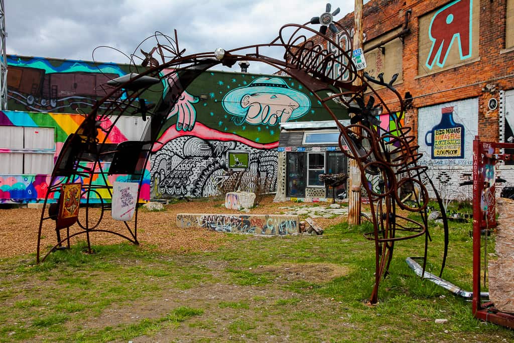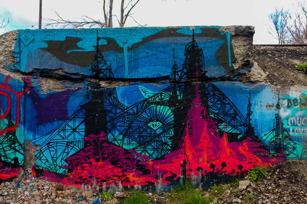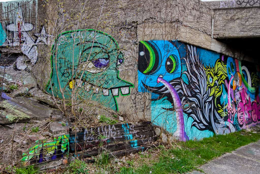 Lincoln Street Art Park can be found at 5926 Lincoln Street, Detroit, Michigan 48208. It’s an abandoned former industrial park. It’s open 24/7 and completely free to access. It’s become an art project of its own with installations in addition to street art. Make sure not to miss the little underpass literally right next to it. The walls of the underpass have some really great pieces as well. While it’s not recommended and most likely illegal, the train tracks right next to the park provides some really great views of it as well.