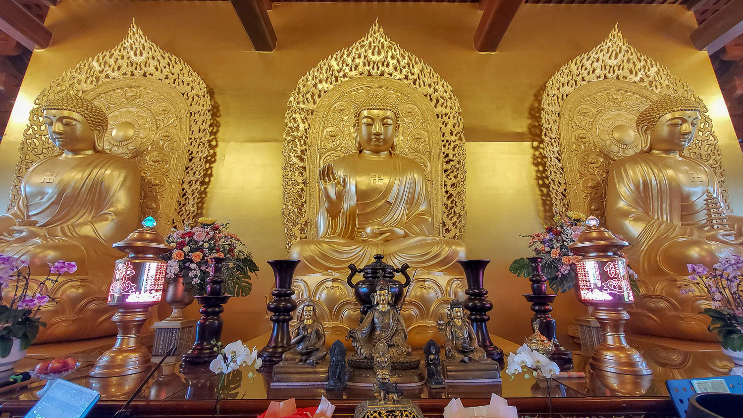 Large golden Buddha on the third floor of the main temple